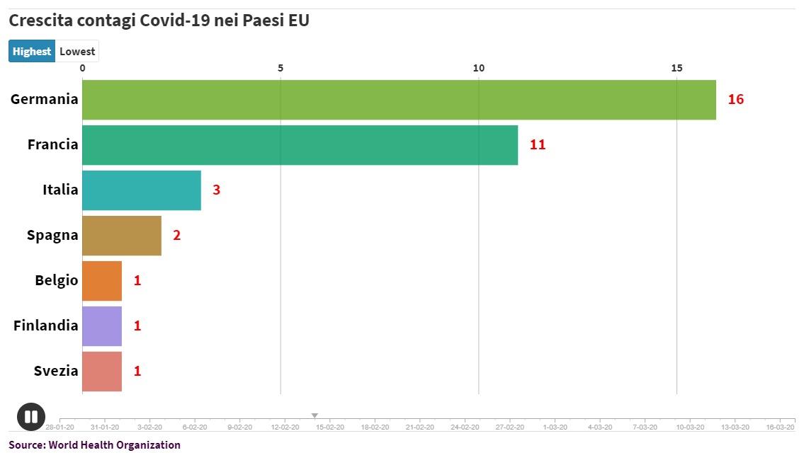 A partire da questi dati abbiamo realizzato un grafico in movimento che mostra la loro crescita nei Paesi europei. È possibile visualizzare i dati sia in modo decrescente (dai paesi che hanno riportato più contagi a quelli che ne hanno riportati meno) e viceversa, cliccando sul pulsante in cima al grafico.