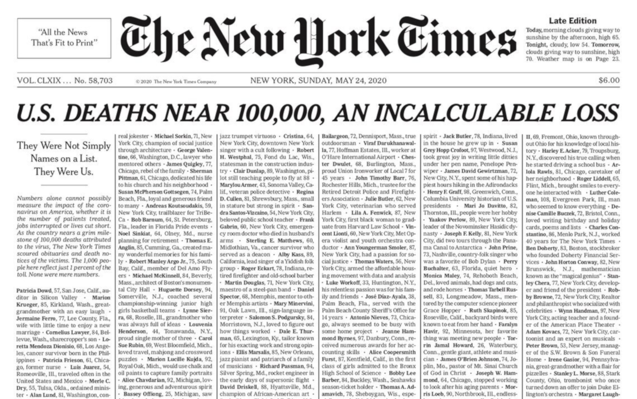 «Un enciclopedico conoscitore della Hollywood degli anni d’oro, Gerald». «Orgogliosa madre single di tre bambini, Louvenia». «Era in pace sulla sua Harley, Thomas». Il New York Times ha dedicato la prima pagina del 24 maggio 2020 ai 100.000 morti di Coronavirus negli Stati Uniti, cercando di dare un volto a questi numeri scrivendo per ciascuno di essi: nome, età, città di provenienza e una riga, o poche parole, che li rappresentassero. «L’America sta velocemente avvicinandosi ad una cupa pietra miliare» si legge nella versione online del giornale, «ogni figura qui rappresenta una delle 100.000 vite perse finora» e su uno sfondo grigio come la pietra si srotola un cimitero di piccole figure che potrebbero formare una vasta nebulosa informe se non fosse per gli affettuosi cartigli che ne restituiscono invece un volto umano.