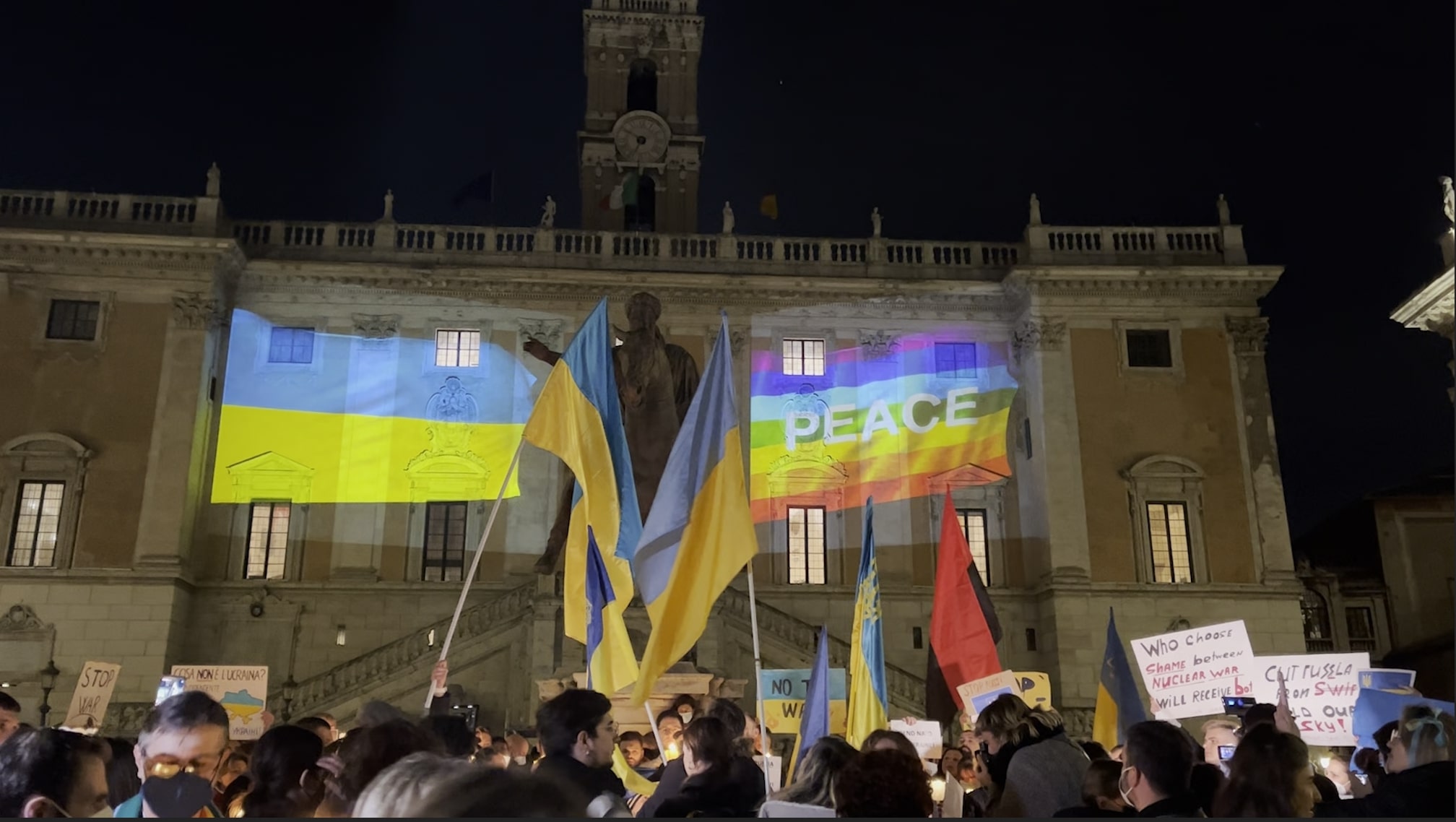 “No to war”, “no alla guerra” si legge sui cartelli delle persone che si sono radunate a Roma, in Piazza del Campidoglio, per manifestare contro il conflitto in Ucraina. Italiani, ucraini, russi: la fiaccola in mano, la bandiera blu e gialla dipinta sul volto e una sola voce per chiedere che la pace venga riportata in Europa.