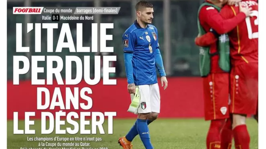 Dalla Francia, L’Equipe, offre un’immagine ancora più estrema della situazione della nazionale allenata da Mancini. “L’Italia persa nel deserto” si legge nell’apertura del più prestigioso quotidiano sportivo internazionale. “Un nuovo fallimento dopo quello di Russia” si legge nel sommario.