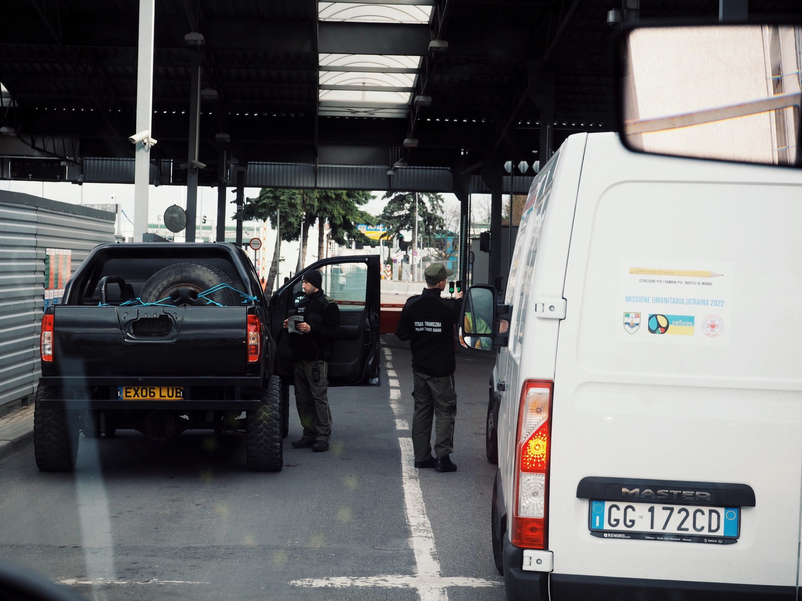 Le palazzine, su cui capeggia la scritta giallo-blu Україна, sono scrostate e ricoperte da una patina polverosa nera. Lo stile sovietico domina lo scenario e le postazioni dei funzionari doganali sono sobrie e austere. Ogni mezzo è controllato più volte da soldati armati di fucile AK-47. Si dichiara solo il trasporto di cibo e beni di prima necessità, nessuno menziona farmaci e apparecchiature mediche. Il timore infatti è che vengano sequestrati alla frontiera e rivenduti al mercato nero. Ultimo scoglio per avere il lasciapassare è sapere dove avverrà la consegna della merce perché da qualche giorno la situazione anche intorno a Leopoli è tesa. Nelle ultime ore infatti sono stati avvertiti forti boati anche nelle regioni più a ovest del paese.