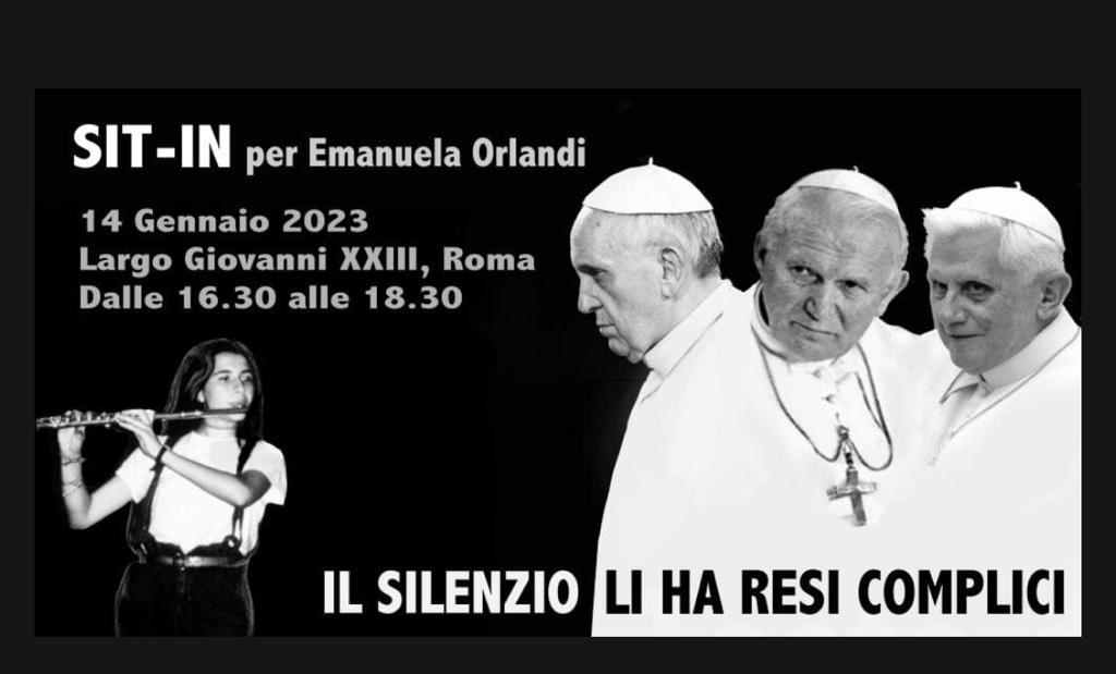 Nessuno Stato, nemmeno la Chiesa, può giustificare la criminalità, Verità e giustizia per Emanuela Orlandi, questi sono gli striscioni appesi a Largo Giovanni XXIII a Roma. E poi ce n’è un altro, aperto solo a metà e mostrato solo per qualche secondo, con cui lo stesso Pietro Orlandi aveva annunciato la manifestazione sui profili social. Nell’immagine si vedono i volti di Giovanni Paolo II, Benedetto XVI e Francesco e dalla parte opposta la foto di Emanuela che suona il flauto. In basso campeggia la frase: “Il silenzio li ha resi complici”.