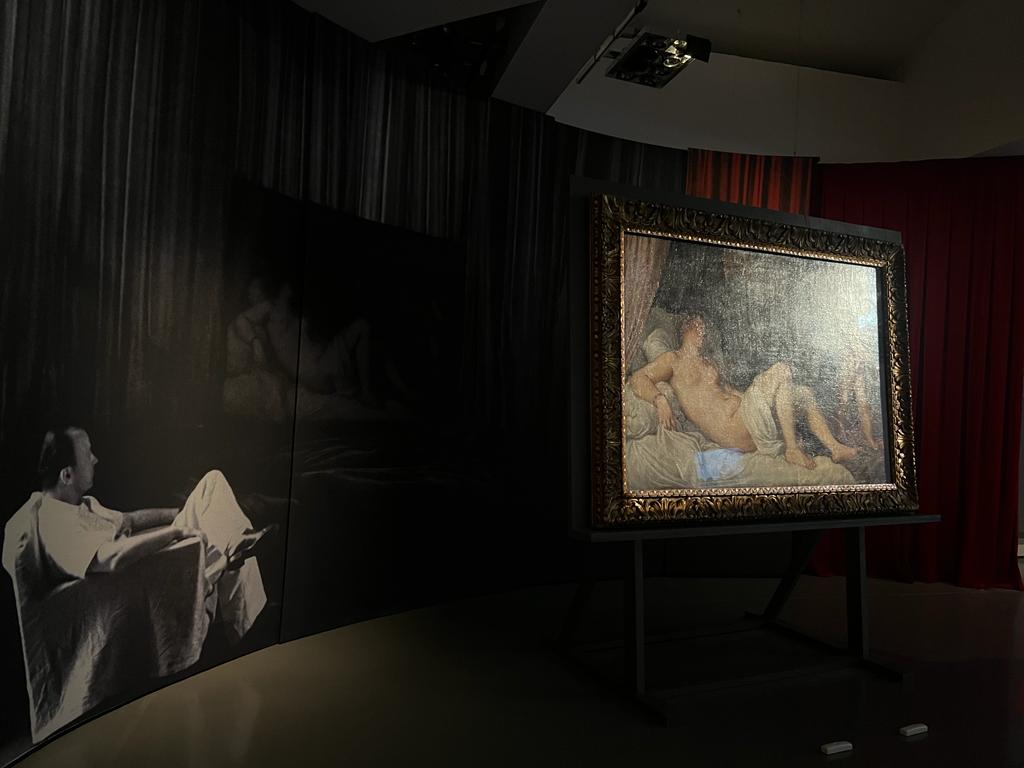 Al termine della mostra, sotto lo sguardo ormai estasiato del visitatore, le illuminazioni si fanno più fioche e nell’ultima stanza un solo faro di luce è diretto verso il sublime corpo disteso della Danae di Tiziano, che viene osservata con scrupolosa attenzione da Rodolfo Siviero. Cacciatore di opere d’arte, agente segreto e storico dell’arte, Siviero fu una controversa figura nota per il suo lavoro di recupero delle opere trafugate durante la Seconda Guerra Mondiale. Una fotografia nello sfondo lo ritrae seduto su una poltrona bianca mentre osserva la tela. Con un gioco di prospettive i presenti in sala si trovano difronte a un nuovo quadro in cui, ancora una volta, il colore del dipinto si staglia contrapponendosi al grigio della fotografia sullo sfondo, ma questa volta lo fa in un abbraccio tra antico e moderno, tra reale e ideale, facendo sentire i presenti testimoni di un momento di intima contemplazione della bellezza.