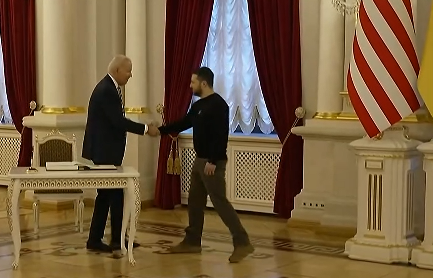 Mentre risuonavano le sirene della contraerea Biden e il presidente ucraino Zelesnky hanno passeggiato lunghe le vie della città discutendo dei prossimi aiuti e hanno poi reso omaggio a un memoriale in ricordo delle vittime dell’invasione.