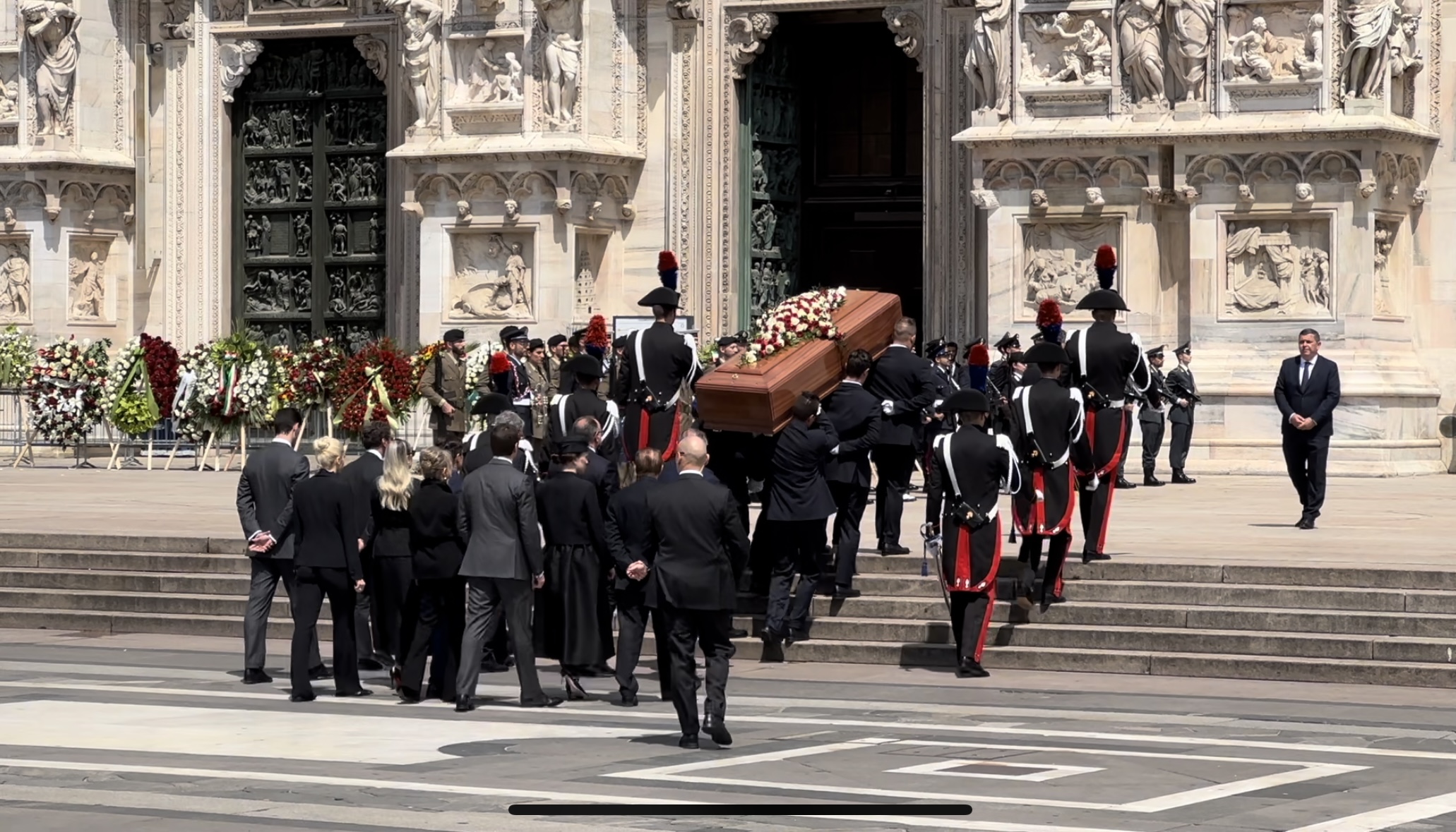 Alle 14.20 dai maxischermi compare la villa di Arcore e per la prima volta si intravede il carro funebre con la bara di Silvio Berlusconi. In 25 minuti la salma fa il suo ingresso nel cuore di Milano accompagnata da un forte boato. Le bandiere del Milan sventolano e mentre la famiglia accoglie il feretro si sente all’unisono il coro «c’è solo un presidente». Le porte del Duomo si chiudono e la Madonnina saluta per l’ultima volta il Cavaliere.