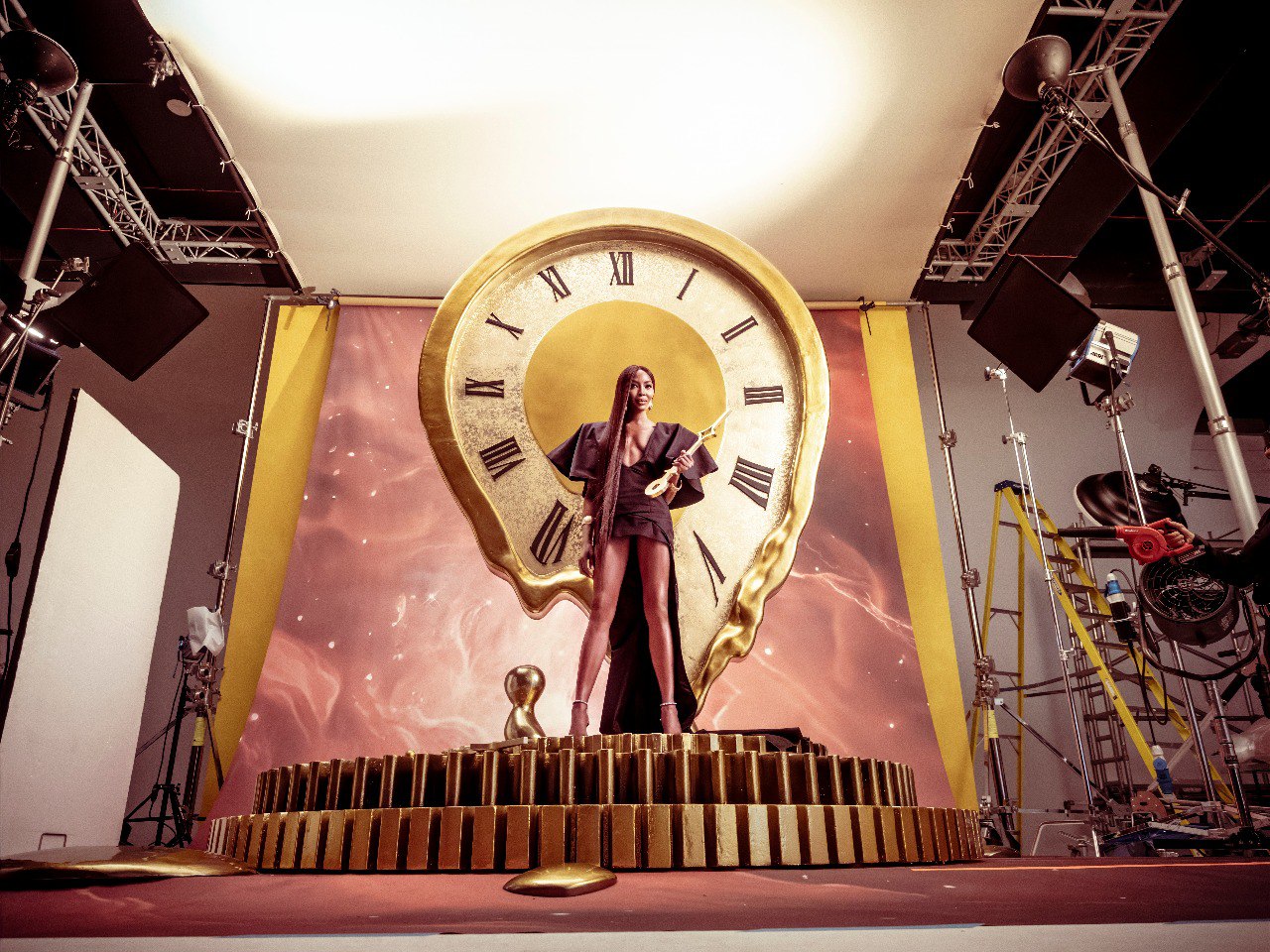 Il modo in cui il giovane ghanese ha scelto di interpretare l’atemporalità è ben riassunto nel manifesto che lui stesso ha scritto. “Creare. Ispirare. Imparare.Non quando fermarti ma quando andare avanti. Quando colpire, con o senza paura. La nostra esistenza può essere finita. Ma il nostro esempio può essere infinito. Non nasciamo senza tempo. Diventiamo senza tempo”. Una sorta di filo grazie al quale orientarsi nel labirinto di immagini e personaggi che Gyasi con la sua macchina fotografica ha immortalato. Da Naomi con in mano le lancette di un orologio alla cantante Tiwa Savage i cui capelli vengono inchiodati a un cuore con le frecce scagliate dall’arco di Eros. Dall’attore Idris Elba circondato dia valigie alla poetessa Amanda Gorman, che nel backstage posa insieme alla scrittrice Margot Lee Shetterly in un vestito giallo vaporoso e pieno di piume. Da un bambino che interpreta lo stesso Prince Gyasi da piccolo, all’origine del suo personale tempo. E poi l’ultima tappa del viaggio: il ritorno in Ghana con sua maestà Otumfuo Osei Tutu II.