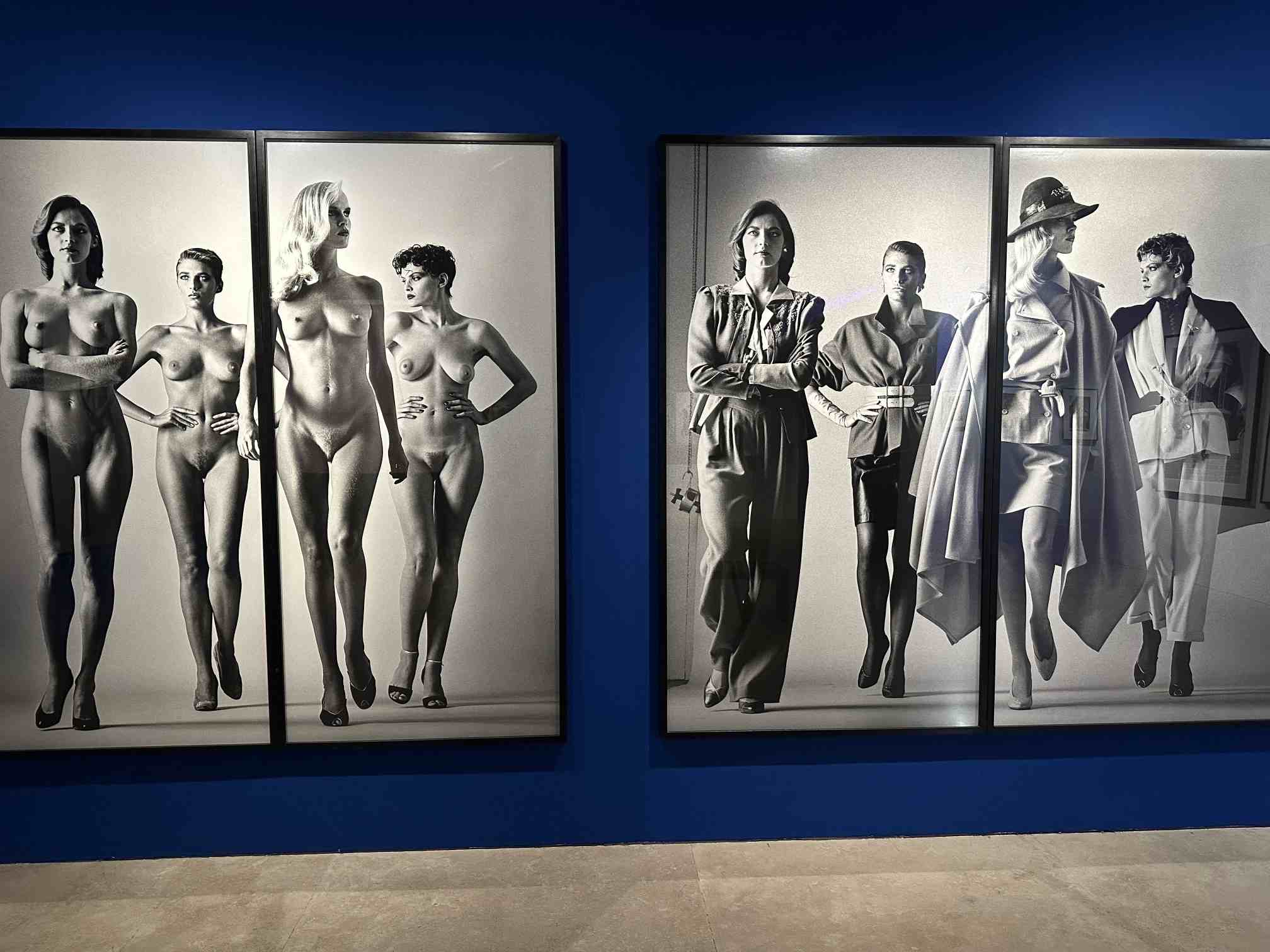 Protagonista è la donna. Emblematica la“Woman examining man”, scattata per Vogue nel 1975 a Saint-Tropez. Qui è il personaggio femminile a osservare l’uomo, sovvertendo ogni schema. Le modelle, mostrate in un primo scatto vestite, vengono poi ritratte nella stessa posizione senza abiti. La pubblicazione dei “Naked and dressed” suscita enorme scandalo e consacra l’unicità di un protagonista del Novecento che del suo lavoro diceva: «Il mio compito come fotografo ritrattista è quello di sedurre, divertire e intrattenere». Nel rappresentare i corpi nudi, l’artista cattura lo spirito del tempo e si fa portatore di una fotografia inedita e dirompente. Le foto delle donne sono storie dotate di dettagli intriganti: una scimmia, un cane, un falco, un cavallo, un pappagallo accompagnano la figura femminile che domina la scena. Protagonista, ribelle, non curante, seducente, sicura di sé e del suo corpo: è questa la femmina che ricorre in ogni immagine.