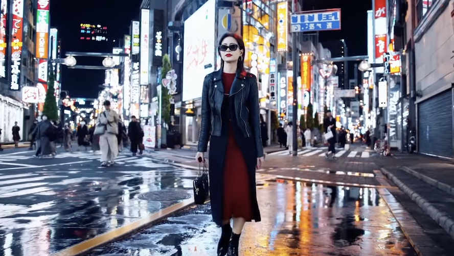 Ancora Tokyo. Esterno notte. Il prompt è molto dettagliato con specifiche indicazioni sull’abbigliamento della ragazza e sull’illuminazione stradale: l’effetto è stupefacente. Le luci dei neon si riflettono in modo coerente sull’asfalto bagnato e sulle pozzanghere. Un po’ lenta e innaturale l’andatura della protagonista e dei passanti. I primi trenta secondi del filmato, tuttavia, sono abbastanza convincenti da farcelo sembrare un trailer cinematografico o uno spot pubblicitario girato a velocità 0.75x. Ci accorgiamo dell’inganno quando si passa a un primo piano nella parte finale del video: la ragazza presenta dei movimenti innaturali. Più volte si ferma e si guarda indietro, senza alcuna apparente ragione.