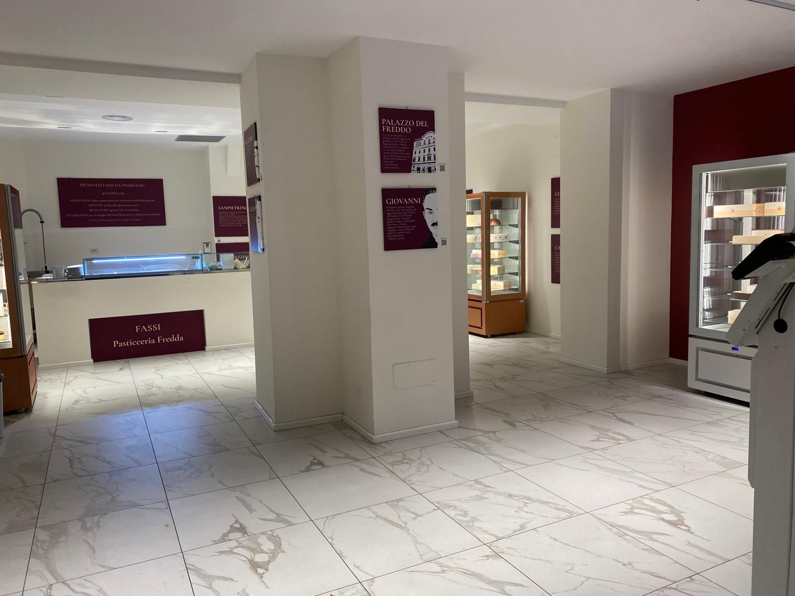Un luogo apparentemente freddo ma che fa immergere il cliente, contemporaneamente, nella modernità e storicità del posto. Federico, commesso, con il sorriso racconta: «Abbiamo aperto da poco. L’obiettivo di Andrea Fassi era quello di mantenere la tradizione del prodotto andando incontro alle nuove esigenze dei clienti. Si è accorto che il gelato classico piace, ma negli altri punti vendita si creano file interminabili quindi ha deciso di fare una selezione dei semifreddi più famosi, garantire il take away e la possibilità di pagare solo con carta di credito diminuendo infine il personale al minimo».