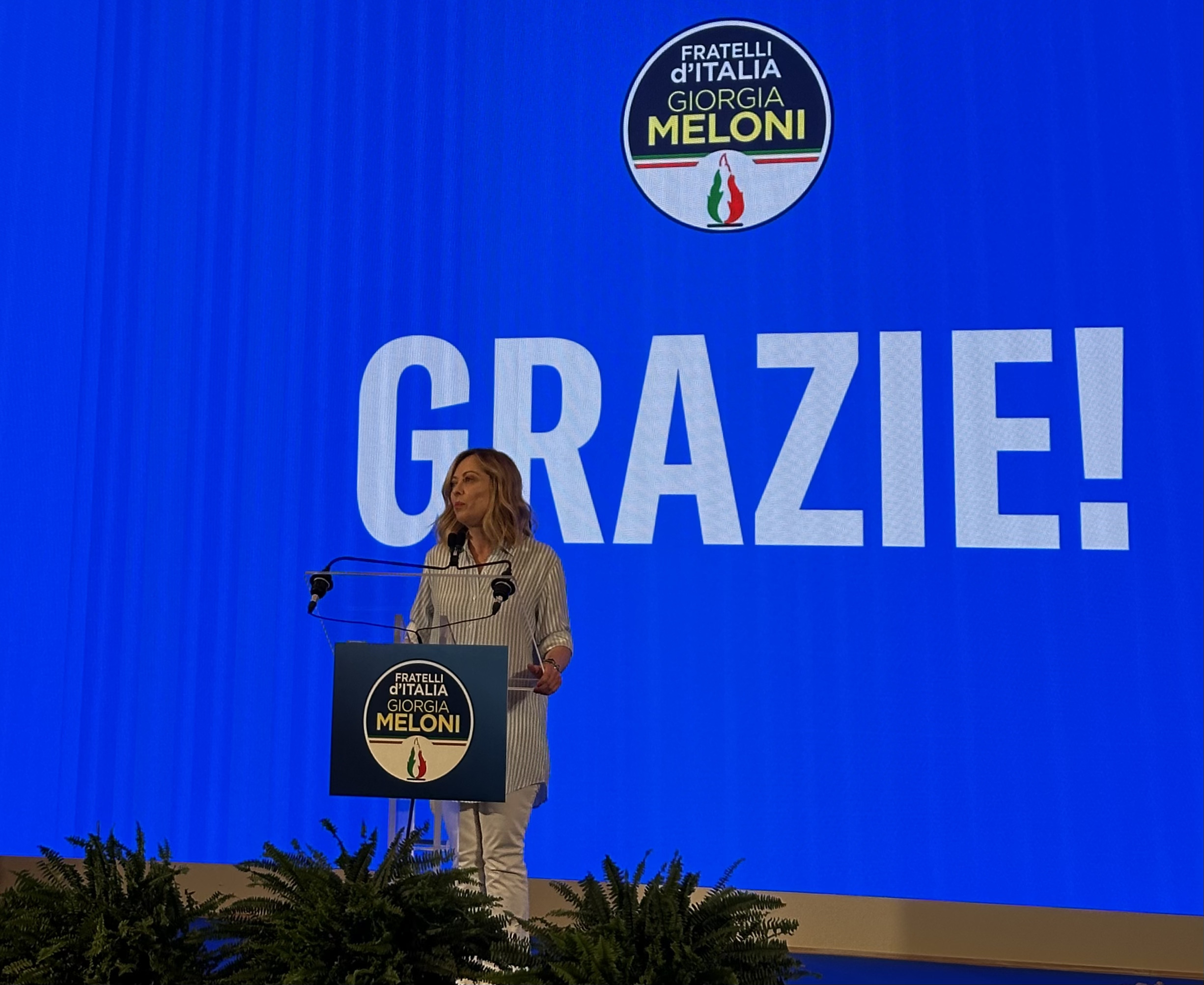 La notte di Fratelli d’Italia, primo partito italiano alle elezioni europee, dura appena 16 minuti. Mancano sessanta secondi alle 2 quando le inconfondibili note di “Ma il cielo è sempre più blu” di Rino Gaetano, suonano in filodiffusione nella sala conferenze dell’Hotel Parco dei Principi, quartier generale del partito per le grandi occasioni elettorali. I cronisti si affannano per cercare di capire da quale ingresso sbucherà Giorgia Meloni, presidente del Consiglio candidata capolista in tutte le circoscrizioni.
