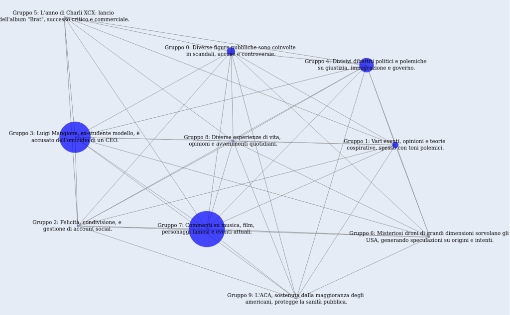 The cluster analysis conducted by IDMO and Zeta Italy News highlights six main macro-topics, organized by the volume of content and average engagement. One cluster revolves around the controversial figure of Luigi Mangione and the murder of CEO Brian Thompson, sparking polarized opinions and strong engagement. The second cluster focuses on celebrities and pop culture, delving into gossip and scandals spanning music and politics. Another cluster critiques the American healthcare and political systems, drawing the attention of audiences interested in socio-political issues. Finally, the fourth one is characterized by conspiracy theories and sensational speculations, fueling debates. The fifth captures the public’s emotional reactions, ranging from empathy and outrage to sarcasm. Lastly, the sixth uses humor and irony to address complex topics, generating high engagement.