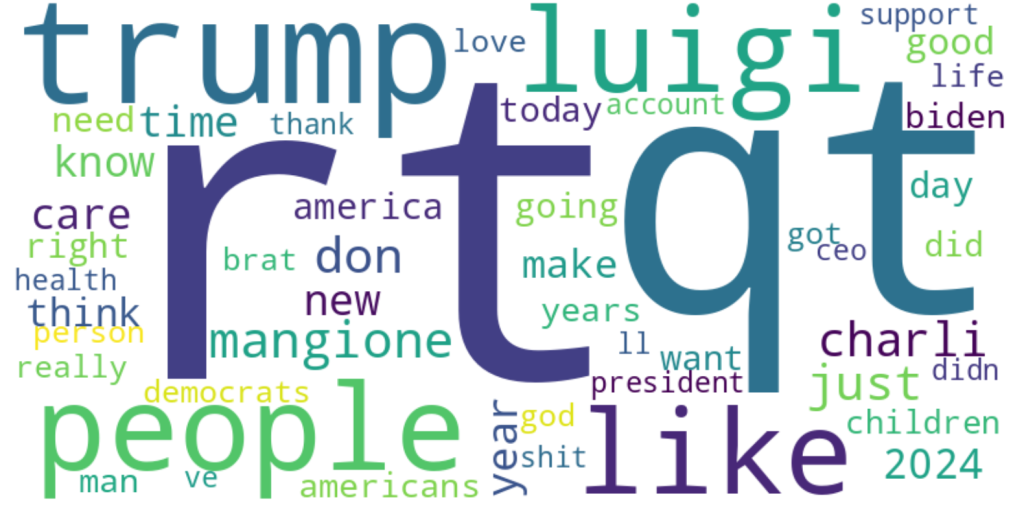 In the analyzed dataset, topics related to Luigi Mangione dominate, driving high engagement due to the sensational nature of the allegations and curiosity surrounding controversial events. Other themes, such as pop culture, political criticism, and conspiracy theories, add diversity to the content, appealing to different audience segments.