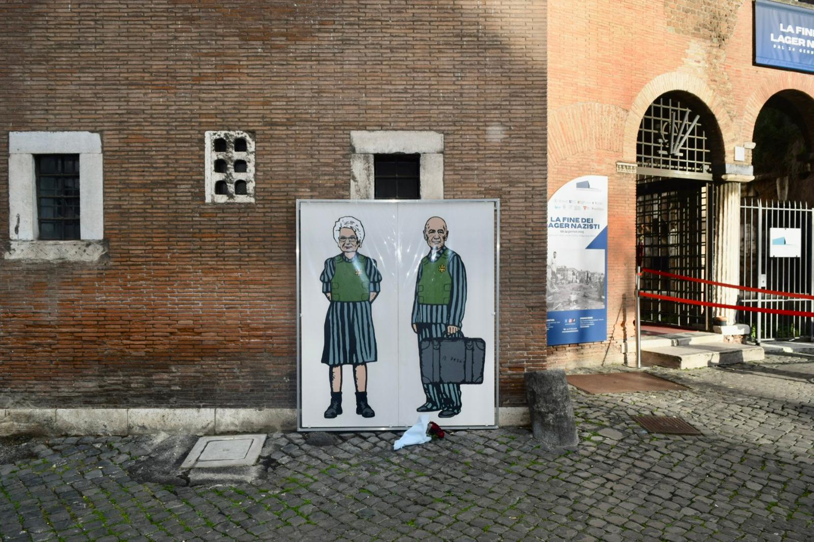 Accanto al Museo della Shoah, balza all’occhio un mazzo di rose rosse a terra avvolto dalla carta. Davanti la raffigurazione dei due superstiti dell’Olocausto Liliana Segre e Sami Modiano, vestiti con un completo a righe e un giubbotto verde con la stella di David al petto. Proprio la senatrice a vita – sopravvissuta ad Auschwitz – si è espressa sul pericolo che la Shoah venga ridotta «a una frase nei libri di storia».