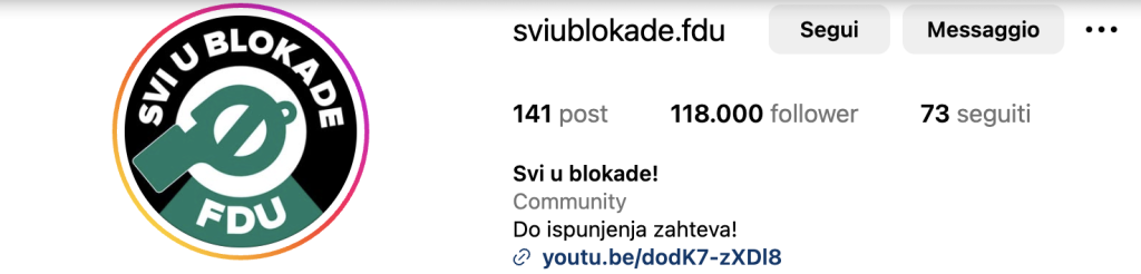 University students’ unions organized the protests, with each faculty using its Instagram profile to share real-time updates on the unfolding events. The phrase “svi u blokadi,” meaning “everyone in occupation,” was added to each account’s nickname.