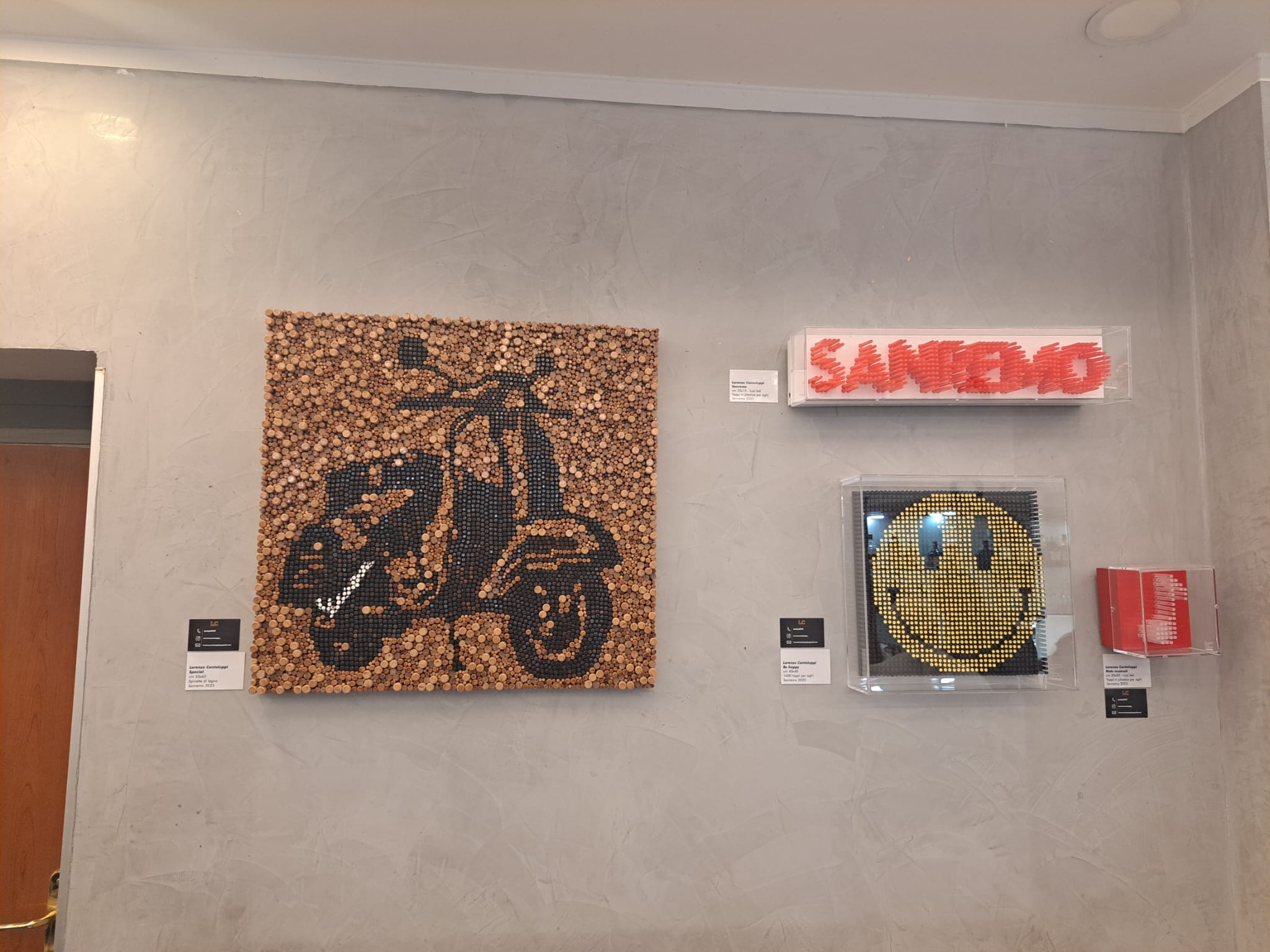 «L’idea di venire qui a Sanremo mi è venuta qualche mese fa, visto anche il grande successo del Festival sui social negli ultimi anni», dice Lorenzo. A dicembre fa il primo viaggio in città, portando sottobraccio “La ragazza con le cuffie”. Tre ore e mezza di macchina e la speranza di trovare qualcuno disponibile ad accogliere le opere. Il primo a dargli fiducia è il Signor Renato: «È stato incredibile perché lui ha accettato subito, vedendo una sola opera – dice – Ci siamo accordati con una stretta di mano». Lo racconta mentre i clienti del bar guardano incuriositi e si complimentano per il quadro con la scritta “Sanremo”. Accanto c’è la “Vespa Special”, una delle preferite di Lorenzo, realizzata con le spinette di giunzione in legno. «Questa tecnica racconta un po’ la storia della mia famiglia, mio padre è un falegname. Ho preso molti consigli da lui», racconta. Alla base del lavoro c’è uno studio accurato del soggetto da rappresentare, poi la scomposizione in pixel e il taglio del pannello di legno: «Bisogna poi verniciare, immettere la vernice nei fori con le siringhe e passare la vernice per lucidare. Tutto il lavoro mi porta via anche più di ottanta ore», spiega con dovizia di dettagli.