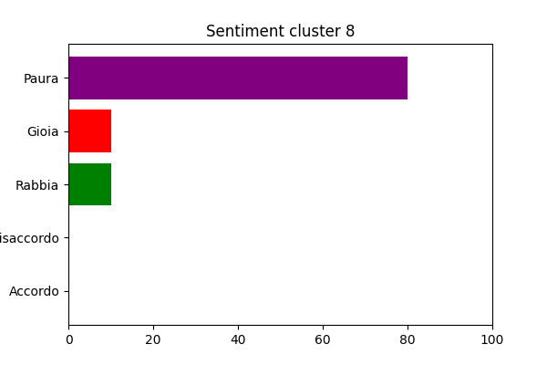 Nel cluster 8, invece, domina la paura perché nei commenti si celebra «il risveglio di un passato dormiente mescolato a una certa eccitazione [da qui il sentimento di gioia] alludendo a violenze e genocidi passati con espressioni di desiderio di vendetta o di una “purificazione”. C’è inoltre un diffuso senso di catastrofe imminente». Ma ci sono anche gli utenti che «cercano di giustificare il gesto negando la sua natura fascista», quelli che «invocano violenza e morte contro i nemici percepiti», ma anche persone che «esprimono preoccupazione per l’immigrazione di massa in Europa percepita come una minaccia alla cultura e alla sicurezza nazionale».