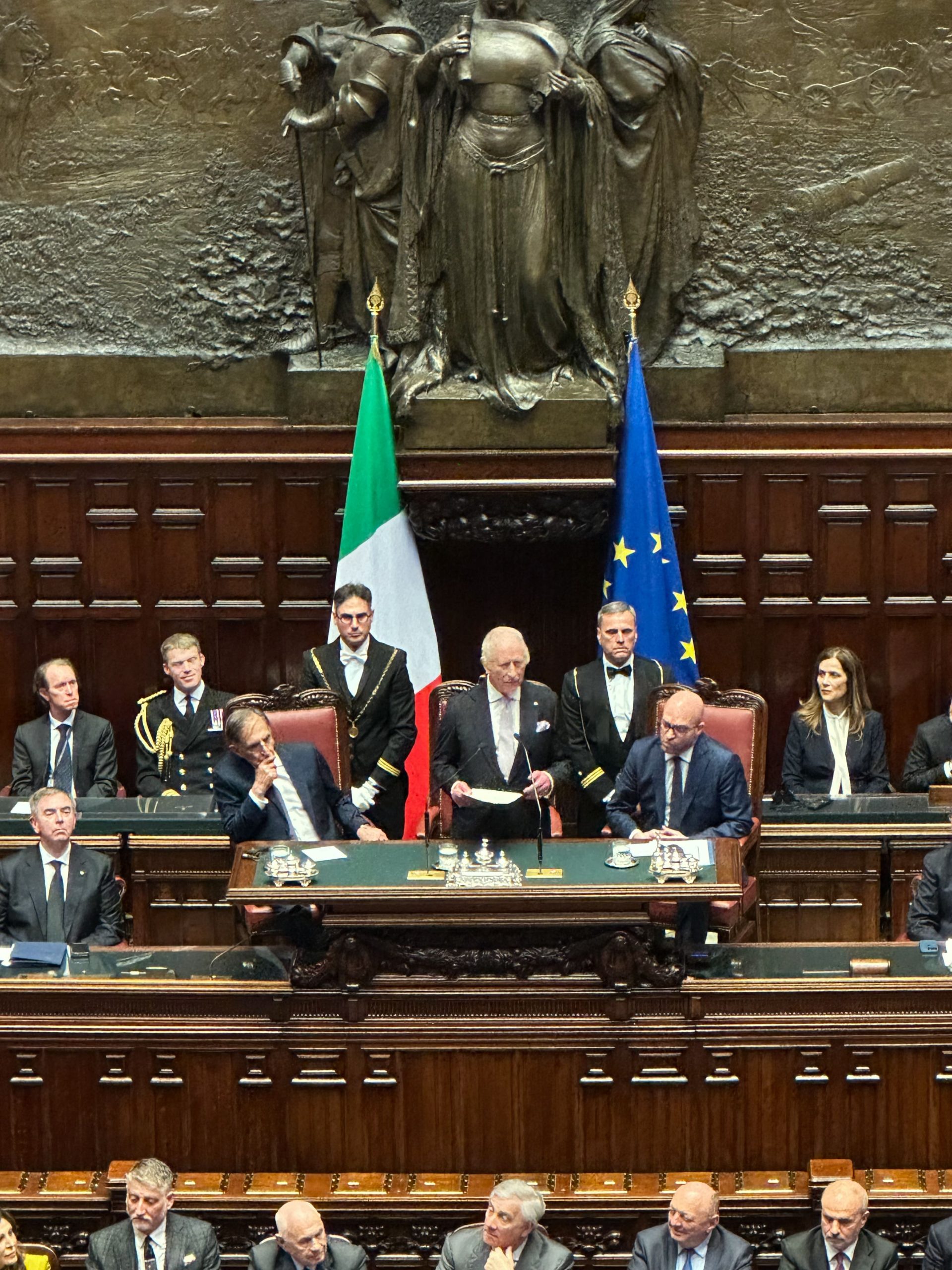 Il Parlamento è gremito, tutti hanno preso posizione, l’impazienza dei presenti è tangibile. Con qualche minuto di ritardo rispetto a quanto prestabilito, fanno il loro tanto atteso ingresso Re Carlo III e Regina Camilla d’Inghilterra. Il Re si siede al centro tra il Presidente del Senato Ignazio La Russa, alla sua destra, e quello della Camera Lorenzo Fontana, alla sua sinistra.