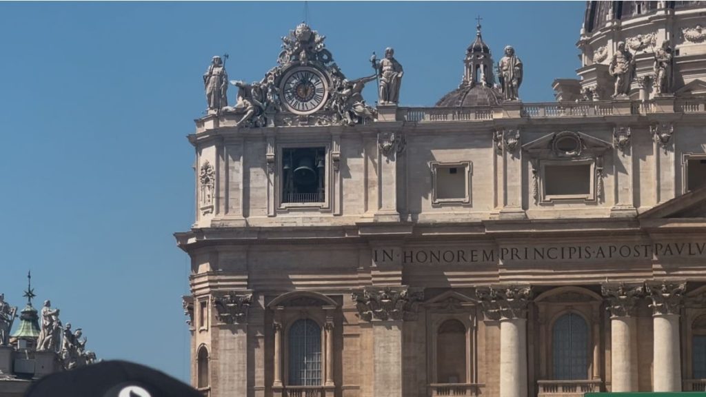 I bambini giocano in piazza ignari di ciò che sta succedendo, c’è chi mangia il gelato al mattino come se fosse già arrivato il mese di agosto, e chi prega emozionato, con il rosario tra le mani nel tentativo di isolarsi in un momento di spiritualità. Una libreria ha attaccato sulla vetrina la foto di Papa Francesco con una scritta di ringraziamento. Sui gradini ci sono persone vestite con pantaloncini, t-shirt o camicia leggera, cappellini di stoffa per proteggersi dal sole e bottiglie d’acqua per dissetarsi dopo una lunga passeggiata.