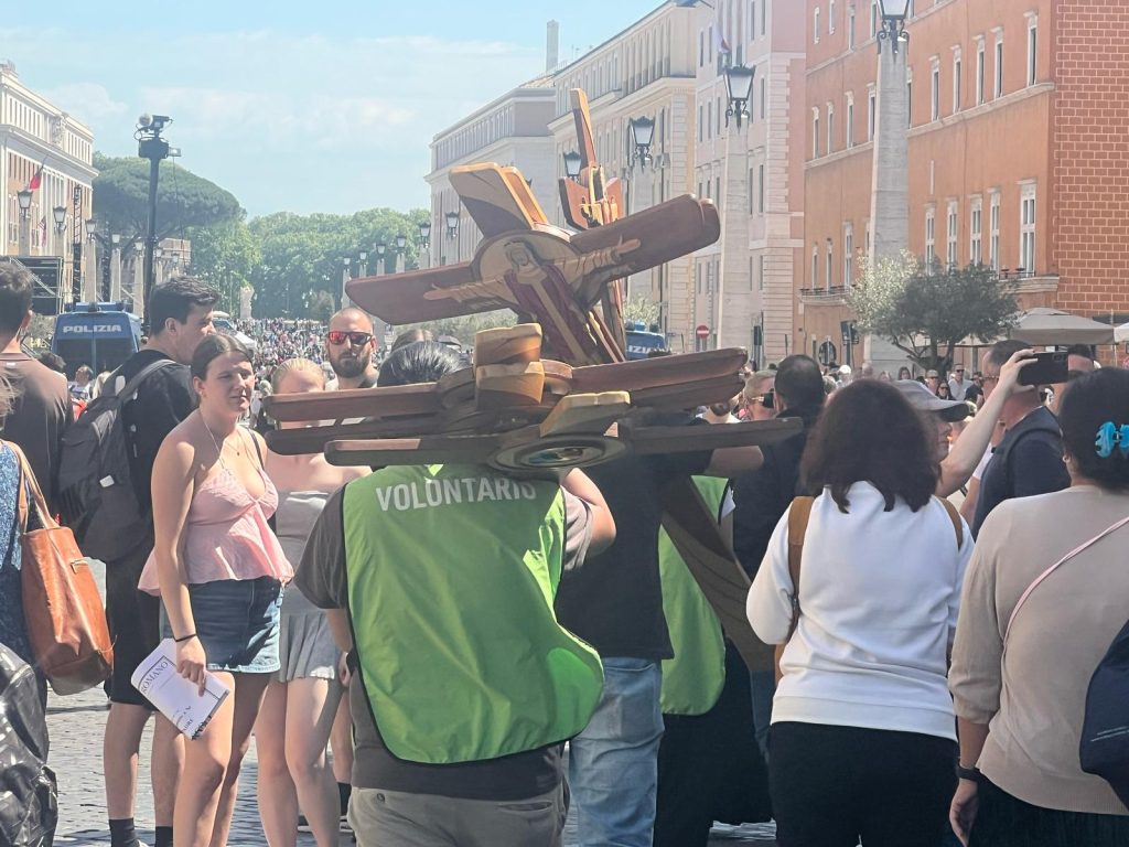 Lo spazio dedicato ai giornalisti si trova vicino ai negozi di souvenir ed è pieno di emittenti internazionali alla ricerca di storie, di novità, e di informazioni sulla gestione dell’ordine pubblico per le prossime settimane. I volontari vestiti con pettorina verde portano in braccio le croci di legno, e sfilano in processione mentre leggono con tono commosso le preghiere scritte in piccoli libri. I cittadini parlano dell’eredità morale lasciata dal Pontefice argentino come guida e della sua figura rassicurante.