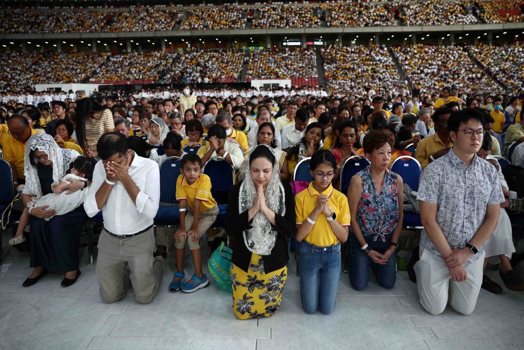 I devoti pregano durante una messa presieduta da Papa Francesco allo Stadio Nazionale di Singapore, 12 settembre 2024