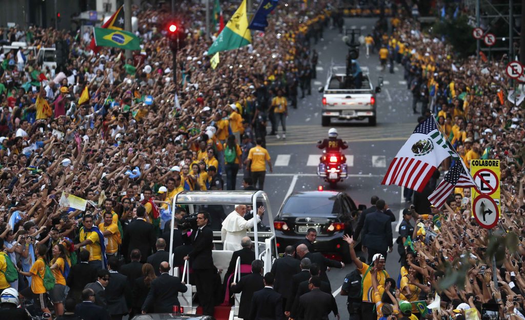 Papa Francesco saluta i fedeli al suo arrivo a Rio de Janeiro, 22 luglio 2013