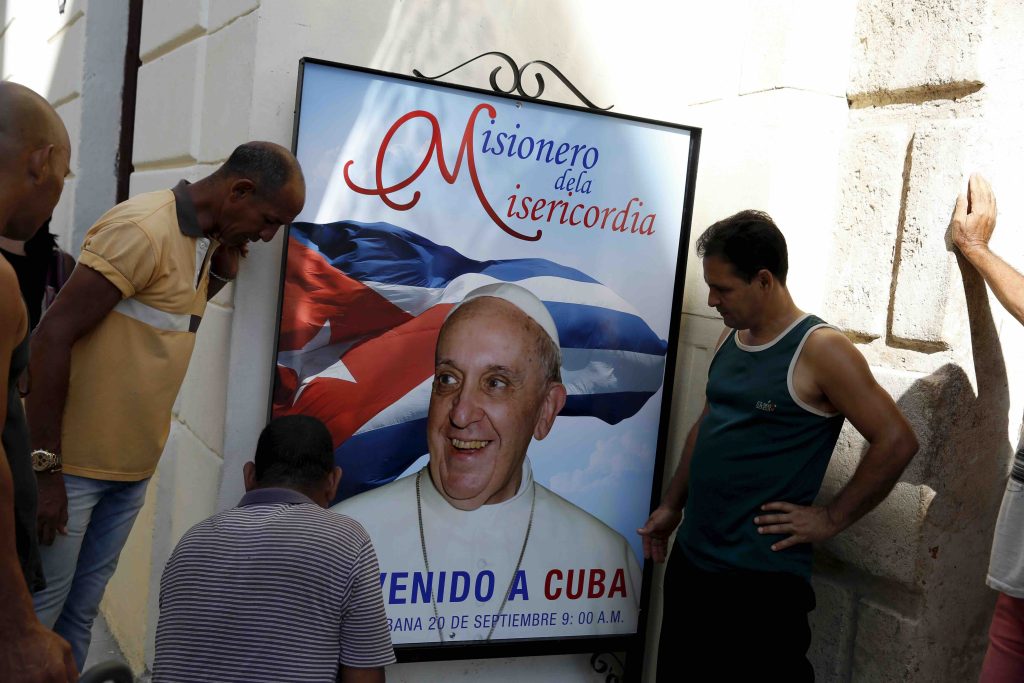 La gente appende un poster con una fotografia di Papa Francesco all’Avana, 18