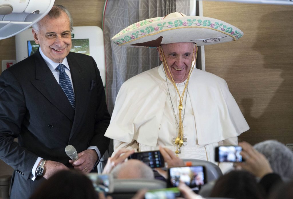 Papa Francesco indossa un tradizionale sombrero messicano, ricevuto in dono da un giornalista messicano a bordo dell’aereo in partenza per un viaggio di una settimana in Messico, 12 febbraio 2016