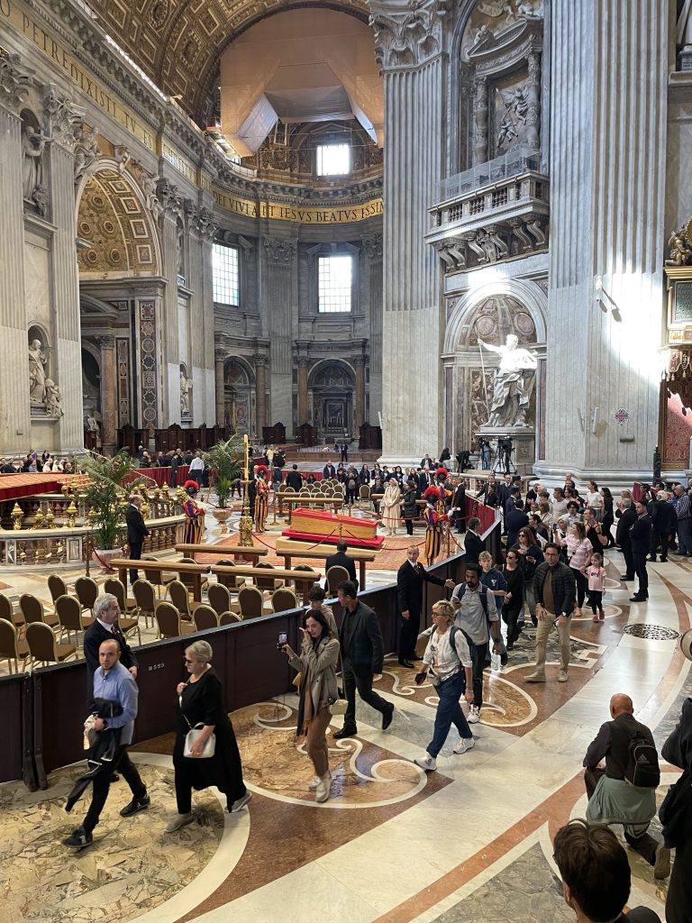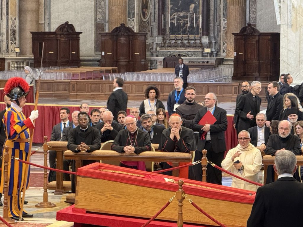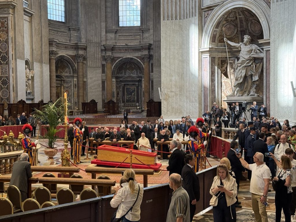 Il feretro è esposto a terra, nella bara di zinco e legno, e non sul catafalco come per i pontefici precedenti. Questo è uno dei cambiamenti voluti da Papa Francesco per snellire il rito funerario.