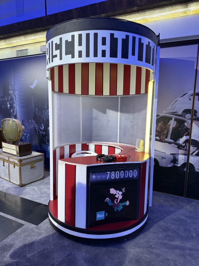 Cabina Rischiatutto: il quiz più seguito e popolare della storia televisiva italiana condotto da Mike Bongiorno dal 1970 al 1974. La cabina, relativa all’edizione del 2016, riproduce quella originale