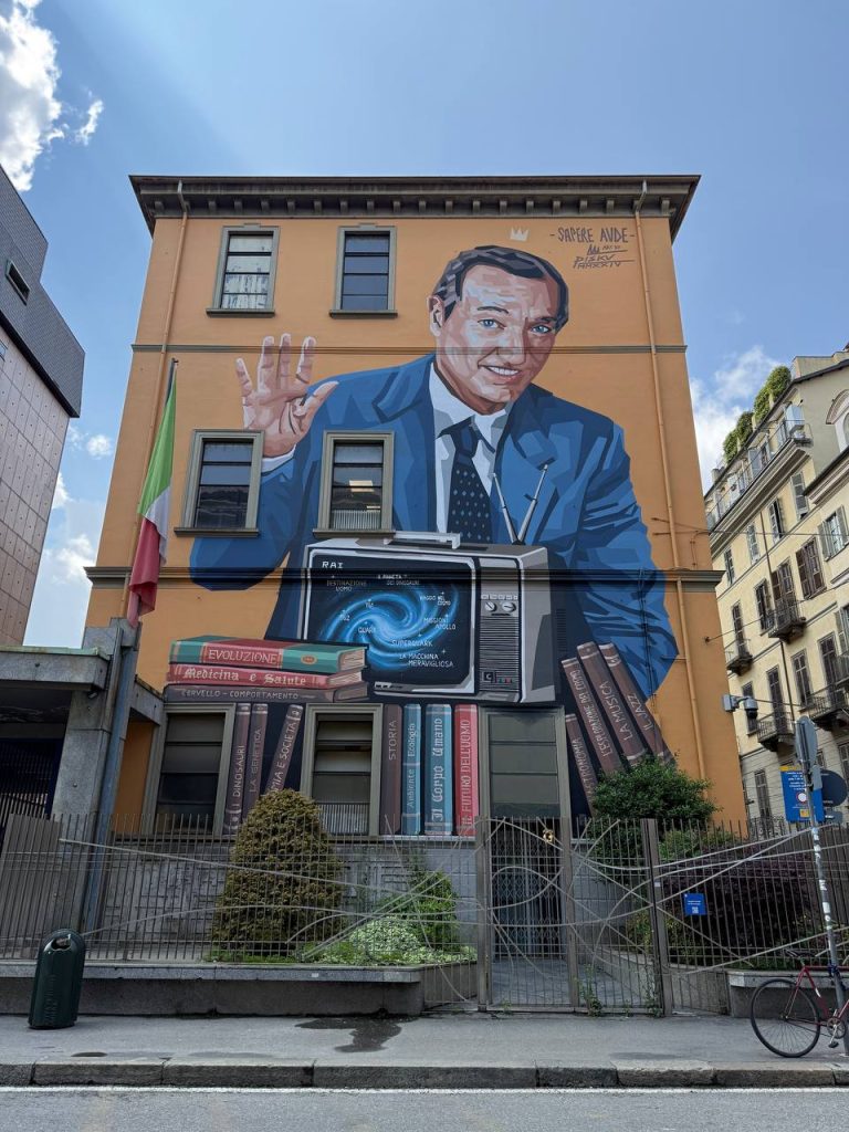 Il murales del torinese Piero Angela sulla facciata della sede Via Verdi 14. L’opera, “Sapere aude” è stata dedicata al divulgatore da Francesco Persichella, in arte PISKV.