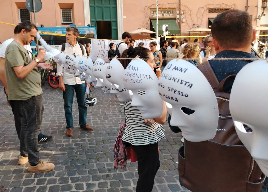 Affianco ad un cartello con scritto “Le nostre vite, la vostra propaganda”, si alternano in tanti al microfono. Ci sono anche insegnanti, studenti e lavoratrici della cultura e dello spettacolo, altri settori segnati da elevata precarietà. A disegnare i cartelli e stendere lo spago per gli striscioni sono le ragazze e i ragazzi delle Assemblee Precarie Universitarie di Sapienza, Tor Vergata e Roma Tre. Ognuno di loro scrive la propria storia sulle maschere bianche. Nella mattina di lunedì 12 maggio la protesta ha toccato i campus. «Il corteo interno ha coinvolto tanti fra dottorandi e ricercatori e abbiamo chiesto che una delegazione venisse accolta dalla rettrice Antonella Polimeni. Ma siamo tornati a casa con un nulla di fatto», racconta Flaminia dell’assemblea della Sapienza. 29 anni, ha da poco finito il dottorato e adesso è disoccupata. Tiene d’occhio ogni giorno eventuali bandi per l’estero, perché «in Italia è tutto bloccato».