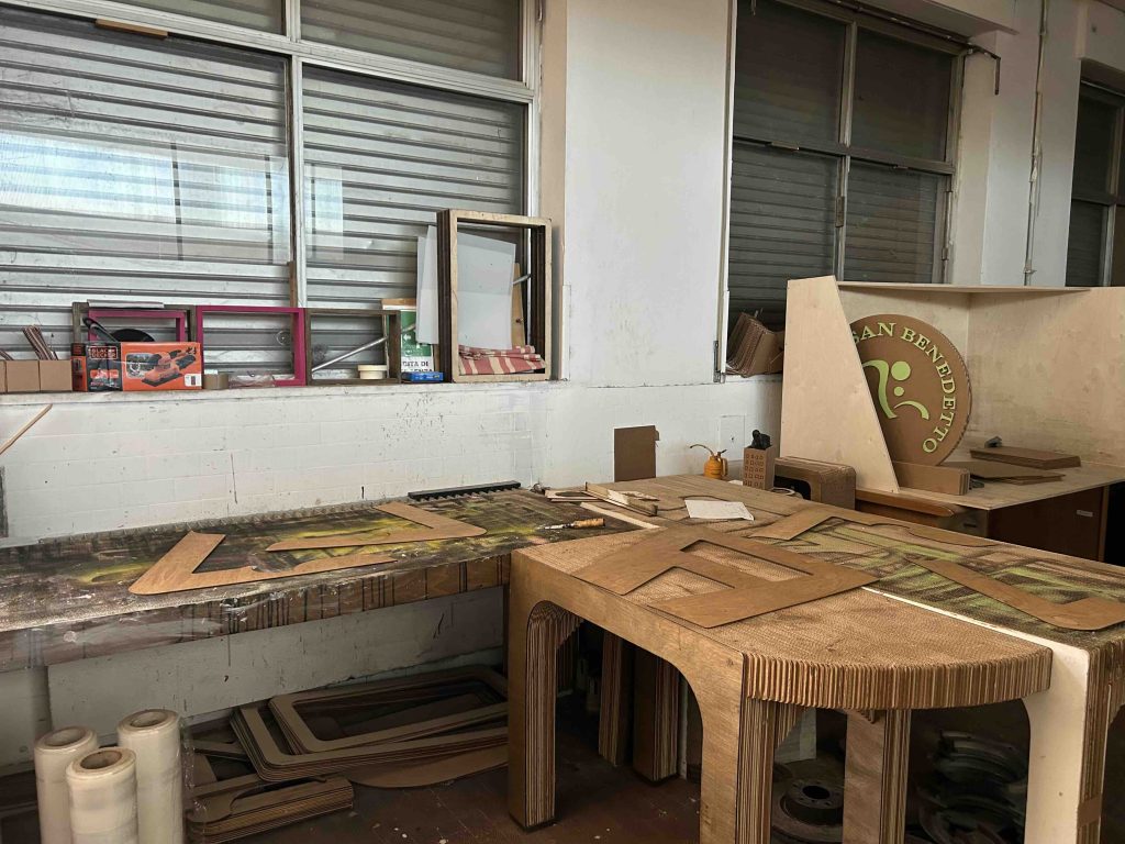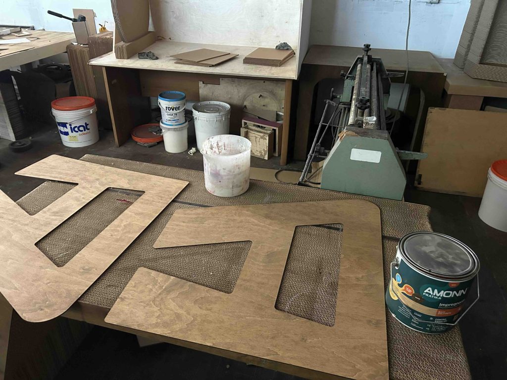 «Il taglio avviene al plotter, pezzo per pezzo, strato per strato, come una lasagna. Poi utilizziamo una macchina del 1952 – che abbiamo ottenuto al tempo barattando quattro sedie e un tavolo – per applicare la colla. L’incollaggio è manuale, poi levighiamo e pitturiamo il legno, di solito faggio o betulla. Il risultato è un mobile riciclabile al 100%», spiega il fondatore.