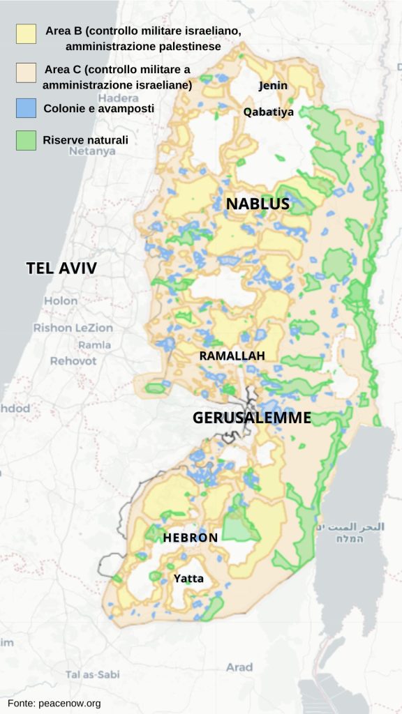 Siamo nell’Area C istituita dagli accordi di Oslo del 1993: il 59% del territorio della Cisgiordania, composto prevalentemente da terre agricole, ancora sotto il controllo militare e amministrativo israeliano.