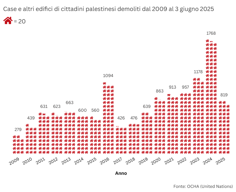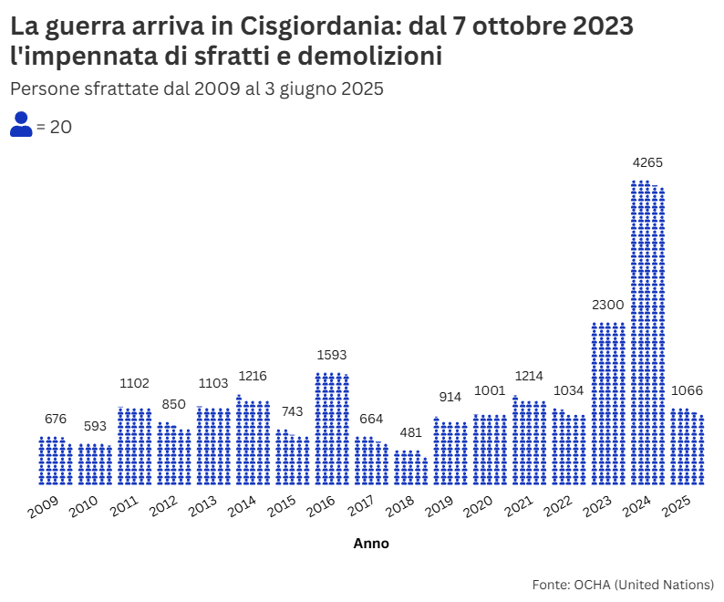 Sempre secondo dati dell’Ocha, dal 7 ottobre 2023 il numero di case e altri edifici di palestinesi demoliti è salito del 14,75% rispetto all’anno e nove mesi precedenti, quello di persone sfrattate dalla propria casa o dalla propria terra del 87,81%. In generale, i palestinesi colpiti direttamente o indirettamente da questi provvedimenti, sono aumentati di quasi cinque volte nello stesso periodo.