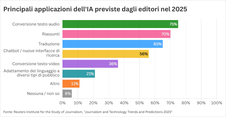 Da allora sembrano passati molti più anni di quelli che indica il calendario. Oggi l’IA è ovunque e ha fatto il suo ingresso anche nelle redazioni. Fin dal 2023, l’agenzia americana Associated Press utilizza dei tool di intelligenza artificiale per ottimizzare i passaggi della produzione dei contenuti. Anche il Financial Times ha sviluppato strumenti come “AI Playground”, che aiuta i giornalisti nello sviluppo di idee, nella sintesi o nell’editing dei pezzi.
