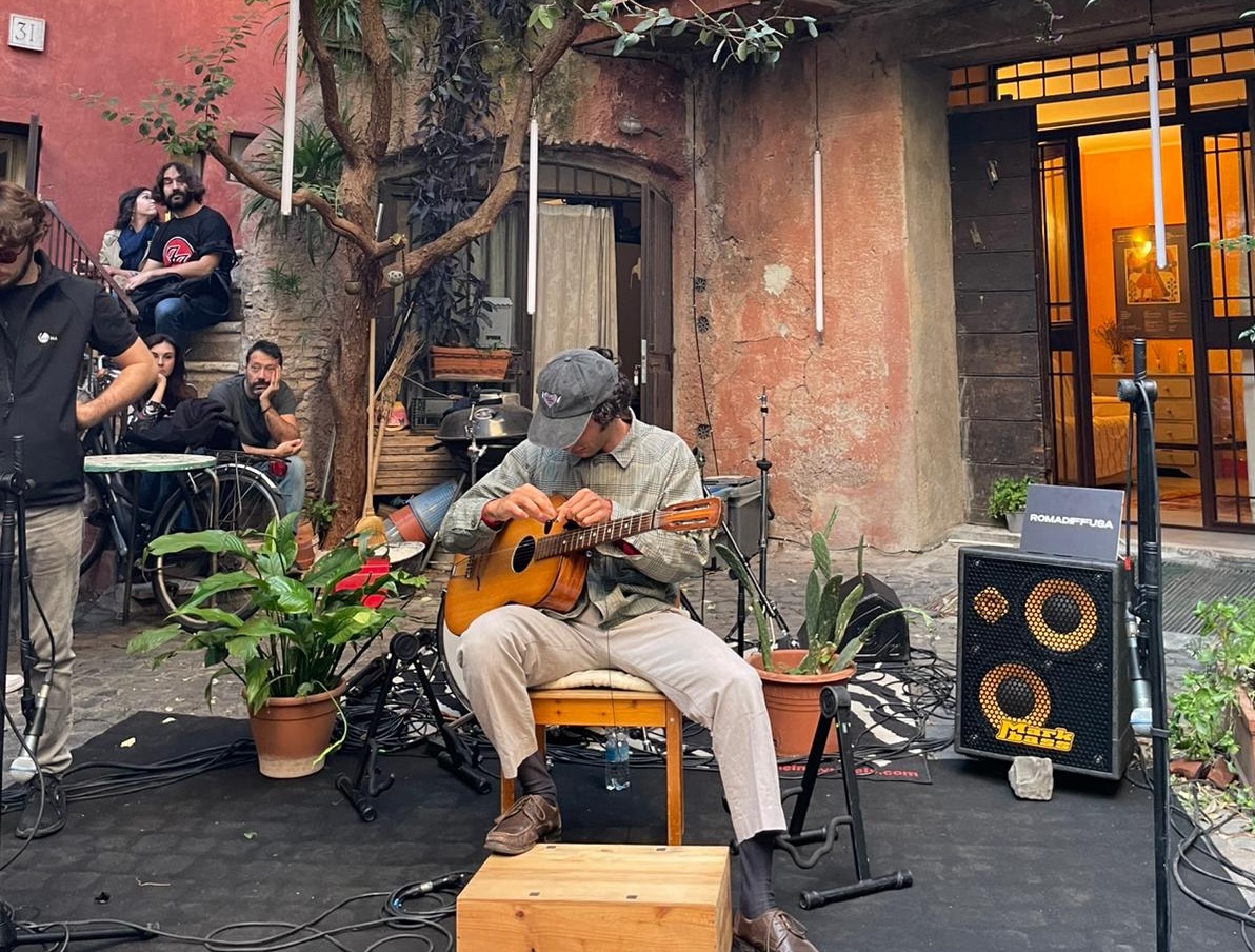 Dopo circa un’ora di attesa, un gruppo di romani, di turisti e di curiosi si è raccolto nel cortile. Nessuna transenna o formalità: tutti in attesa di ascoltare Matteo Pavesi, polistrumentista e produttore che da qualche tempo ha scelto di vivere proprio in questo angolo nascosto della città. Capelli arruffati e una chitarra che mostra i segni del tempo, si è seduto su uno sgabello di legno e ha introdotto il suo concerto con poche parole: «Vorrei che il rispetto per questi luoghi fosse il vero protagonista, rispetto inteso come respicere, guardare di nuovo, con attenzione e cura».