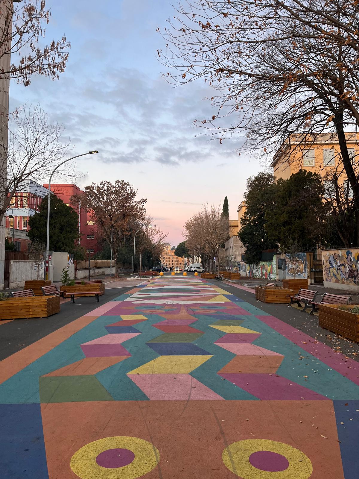 L’asfalto non più grigio e triste, ma colorato e allegro. L’opera, intitolata “Tappeto volante”, è stata realizzata da Gio Pistone, street artist romana, che ha proposto tre diverse versioni del progetto. Sono stati i cittadini a scegliere il loro preferito. Più di 2mila persone hanno votato questo disegno in un sondaggio online a marzo del 2025. Secondo l’assessore alla mobilità, Eugenio Patanè, con le strade scolastiche, “che tolgono spazio alle auto per restituirlo alle bambine e ai bambini di diversi quartieri di Roma, non solo si rende più sicuro l’accesso alle scuole, ma si migliora anche la qualità della vita e degli spazi urbani”.