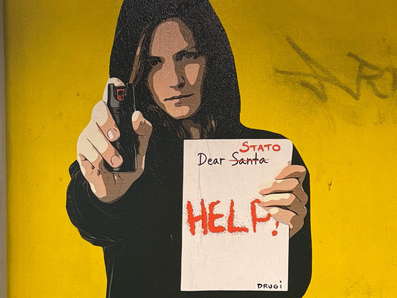 «Quando l’arte chiede aiuto, significa che il silenzio ha già fatto troppi danni. Contro ogni violenza». Con queste parole Drugi, artista che espone le sue opere in formato poster attaccandole per le vie delle città, ha annunciato su Instagram la sua ultima rappresentazione, affissa nella stazione metro B di Basilica San Paolo, a Roma. L’opera vuole richiamare l’attenzione dello Stato sul tema della violenza. L’affissione è avvenuta lo scorso 17 dicembre sulla banchina della fermata, sotto gli occhi dei passeggeri.