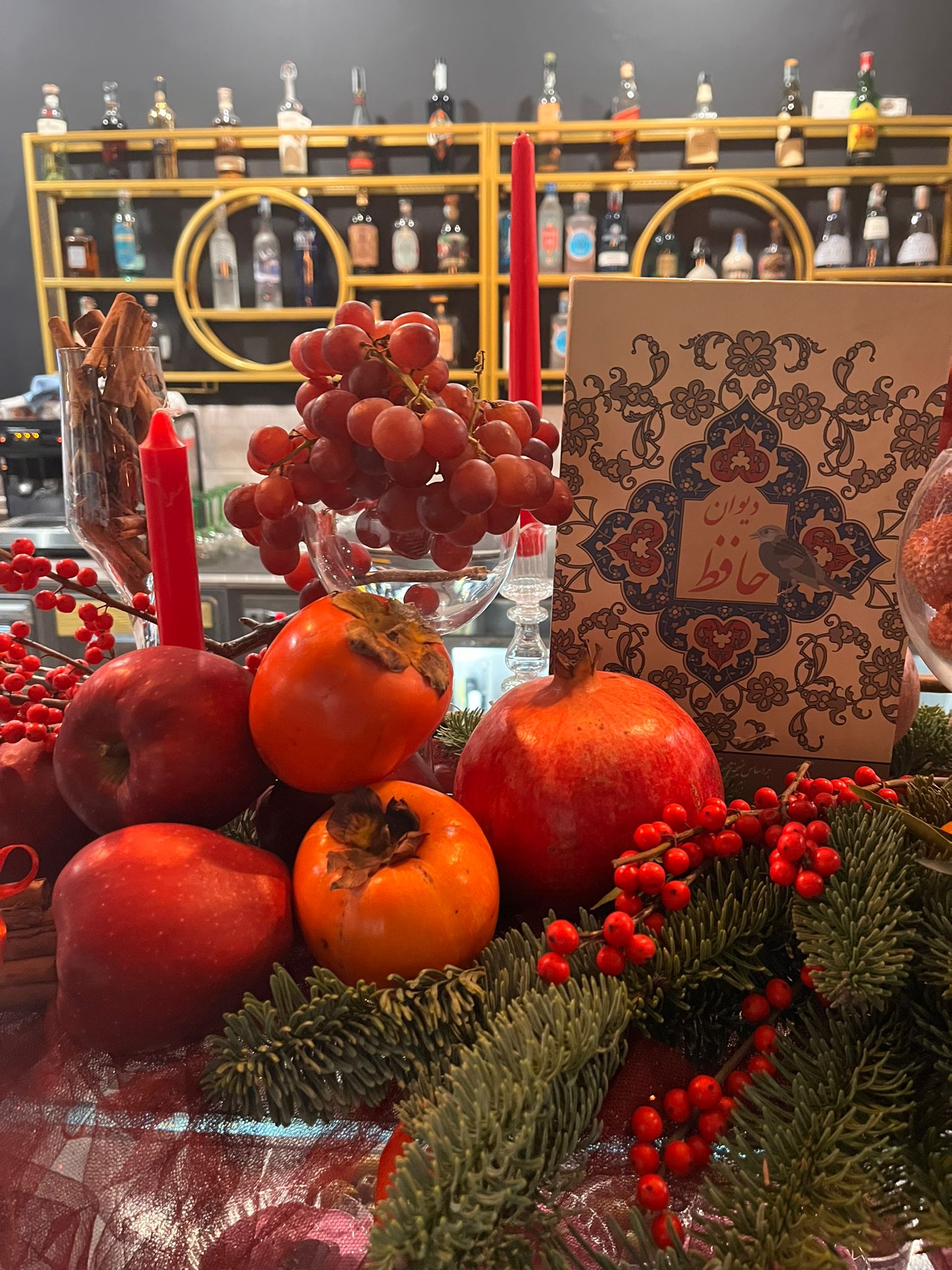La tradizione continua ancora oggi. Sul bancone del locale Shalto ci sono candele, melograni, uva e bacche rosse. Il ristorante si riempie di persone che si conoscono tra loro. Si salutano da un tavolo all’altro e ogni tanto si alzano per fare due chiacchiere o mostrare una foto al cellulare. Per questa notte speciale è previsto un menù fisso in cui vengono serviti piatti tradizionali come il khoresh morgh nardooni, uno stufato di pollo al melograno caratterizzato da una melassa che unisce dolcezza e acidità in un equilibrio precario.