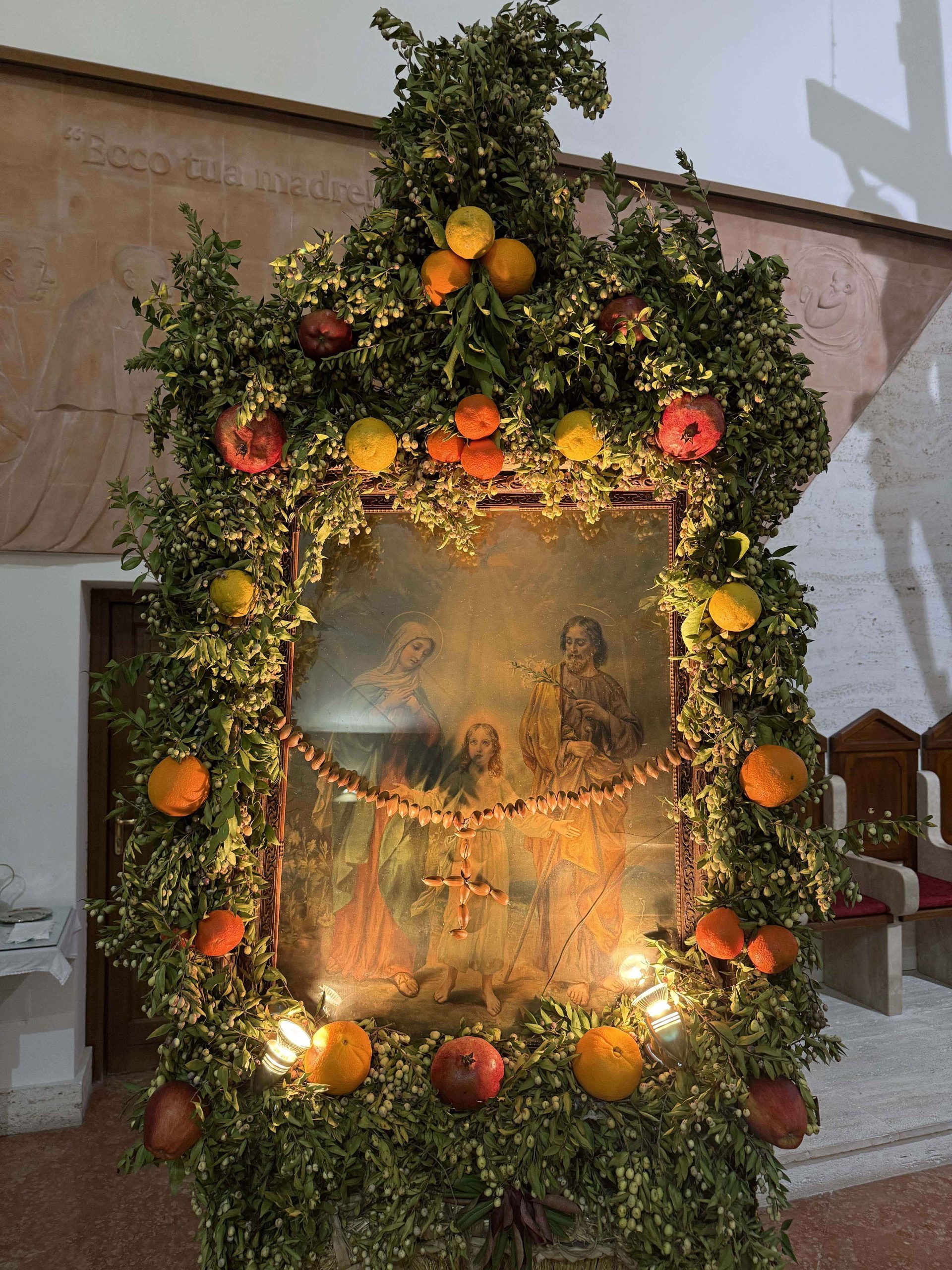 Oltre al momento di preghiera, che avviene la mattina e all’imbrunire, si unisce l’atto creativo: l’allestimento della ‘cona (icona). Con prodotti della stagione, provenienti dalle terre vicine dei contadini o dei fedeli, vengono addobbate le edicole: pendono corone d’alloro, festoni di frutta composti da mele, arance, mandarini, nespole d’inverno, fichi d’India e mele cotogne, ma anche frutta secca come noci o spezie, dalla noce moscata ai chiodi di garofano. Un vero tripudio di colori e fragranze.