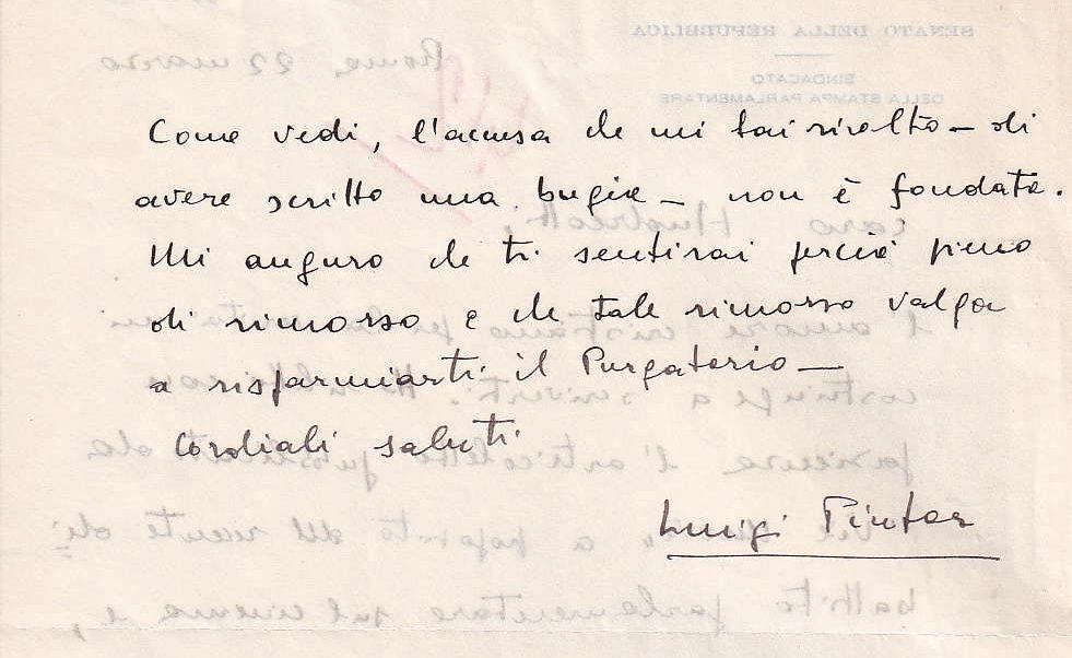 Come vedi, l’accusa che mi hai rivolto – di avere scritto una bugia – non è fondata. Mi auguro che ti sentirai perciò pieno di rimorso e che tale rimorso valga a risparmiarti il Purgatorio.