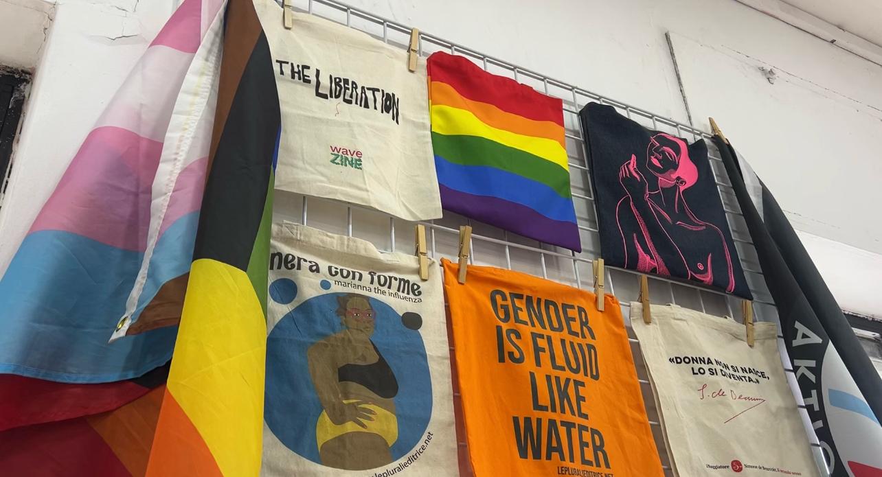 Uno luogo ricco di stimoli visivi e culturali che non passa inosservato, tra colori che richiamano la bandiera LGBTQIA+ e gadget di ogni tipo — spille, zaini, segnalibri — la libreria diventa un piacere anche per gli occhi.