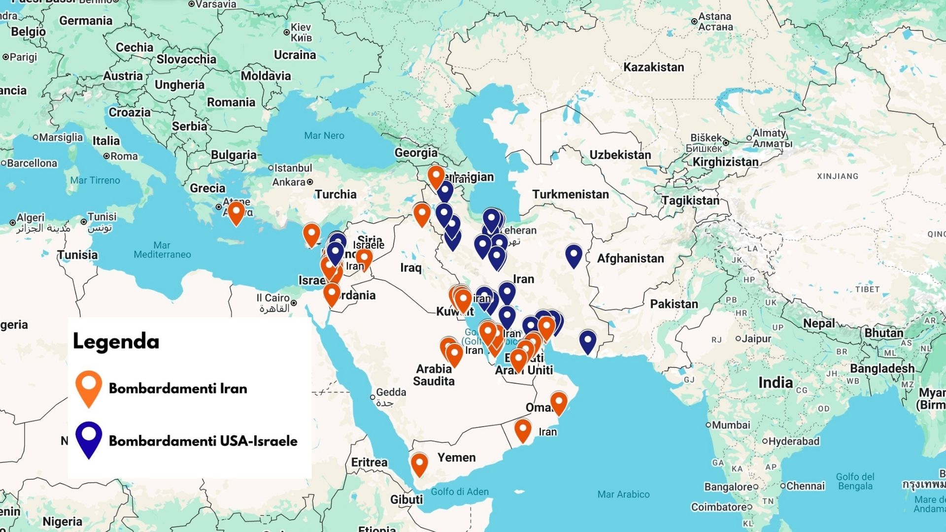 Le località sono distinte in due colori, come indicato in legenda: in blu quelle colpite da USA‑Israele, in arancione quelle colpite dall’Iran.