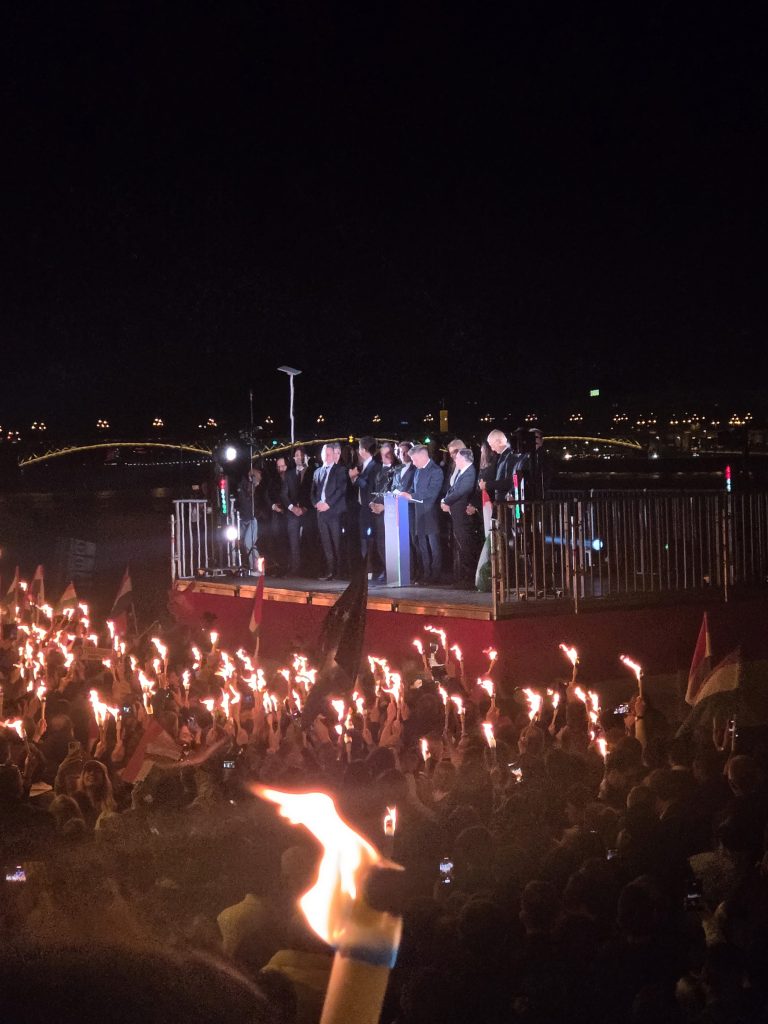 Magyar sale sul palco con una bandiera ungherese. Le persone hanno in mano torce, cartelli o cellulari per filmare il momento storico. «Ce l’abbiamo fatta. Insieme abbiamo rovesciato il regime ungherese», dice tra gli applausi. «Oggi avete fatto un miracolo, l’Ungheria ha fatto la storia», aggiunge mentre la folla canta “Ria-Ria-Hungaria”.
